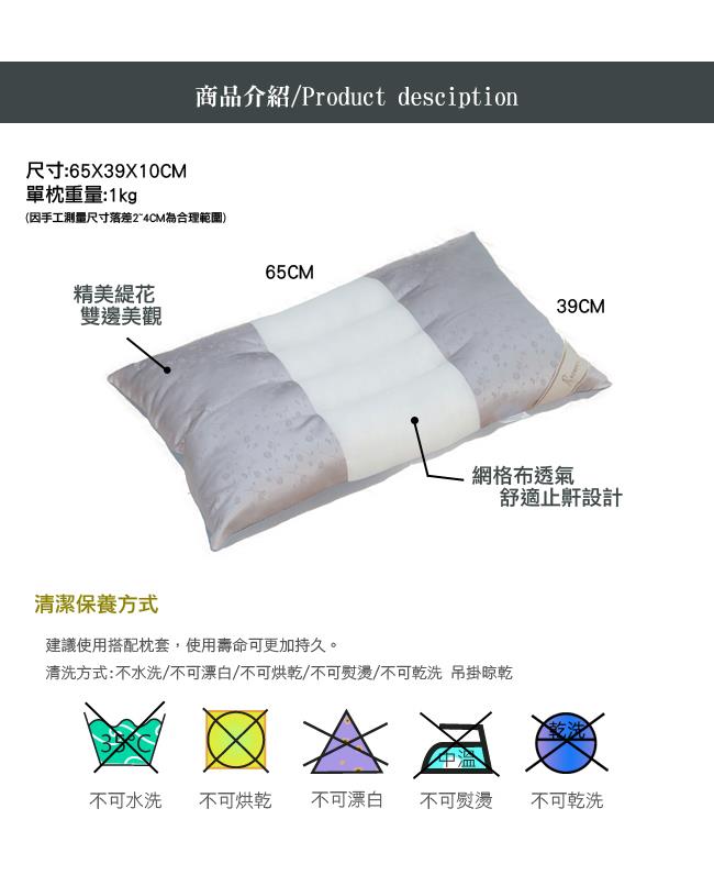 商品訊息簡述: 雙邊提花美觀時尚 中間止鼾設計 網格布透氣不悶熱 對象 成人類型 纖維枕功能 舒鼾入數 2尺寸 長x寬 cm 69X39X10CM 正負3 材質說明 表布100 聚酯纖維填充物 100 聚酯